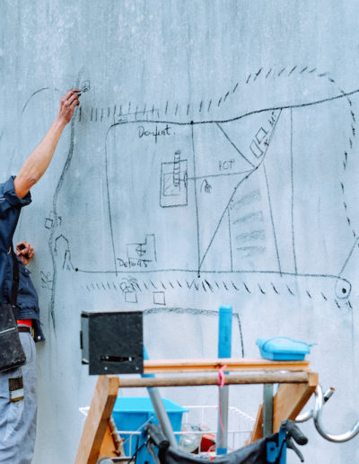 … est une promenade en compagnie d’un comédien en solo, une échelle 3 bruns, un fauteuil roulant, de la cendre dans une banane, du blanc de meudon de quoi faire du fusain pour transformer des échantillons de quartier